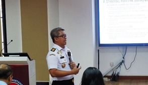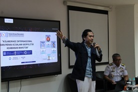 FGD menghadirkan dua narasumber utama. Narasumber pertama Laksamana Pertama (TNI) Askari, P.S.C., S.Ikom, M.Sc., M.A. menyampaikan materi tentang “Perspektif Strategis Dinamika Keamanan Maritim & Pentingnya Kerjasama dalam Menjaga Stabilitas Maritim”. Beliau menjelaskan perbedaan antara maritime security dan maritime safety, serta menekankan pentingnya sinergi nasional, regional, dan internasional dalam menjaga stabilitas kawasan. Berbagai studi kasus, seperti penanganan penyelundupan minyak di Laut Natuna, penyelamatan WNI korban perdagangan manusia di perairan Korea, serta repatriasi nelayan Indonesia di Laut Filipina, menunjukkan bukti nyata efektivitas kerjasama lintas negara.