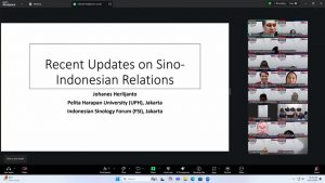 Narasumber pertama, Dr. Johanes Herlijanto, Dosen Hubungan Internasional Universitas Pelita Harapan dan Ketua Forum Sinologi Indonesia (FSI) memaparkan materi berjudul Recent Developments in Sino–Indonesian Relations, dengan menekankan bahwa hubungan kedua negara Indonesia dan Tiongkok telah berkembang pesat sejak 1990, namun tetap dilingkupi tantangan strategis.